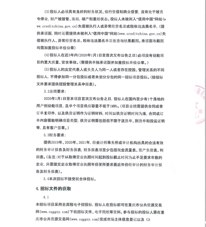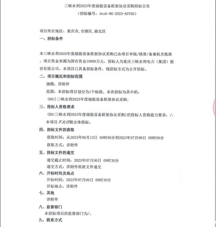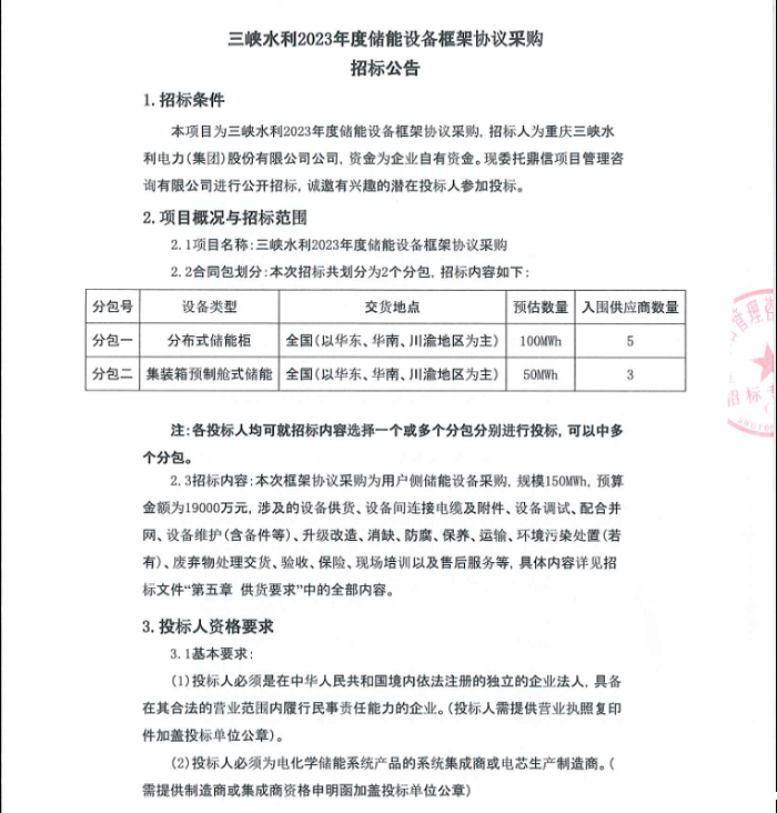 taptap官方下载最新版获悉,近日,三峡水利发布2023年度储能设备框架协议采购招标公告,本次采购内容为用户侧储能设备,规模150MWh,预算金额为19000万元(单价约1.27元/Wh),分为两个包,分别为100MWh分布式储能柜和50MWh集装箱预制舱式储能。要求投标人必须为电化学储能系统产品的系统集成商或电芯生产制造商。且投标人在近3年内(2020年1月1日至首次发布公告之日)必须没有储能项目的重大质量、安全事故。 原文如下: |